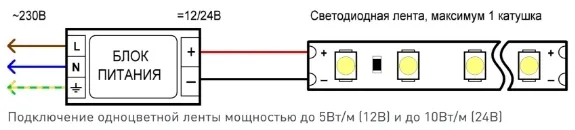 - Схемы подключения светодиодных лент одноцветных
