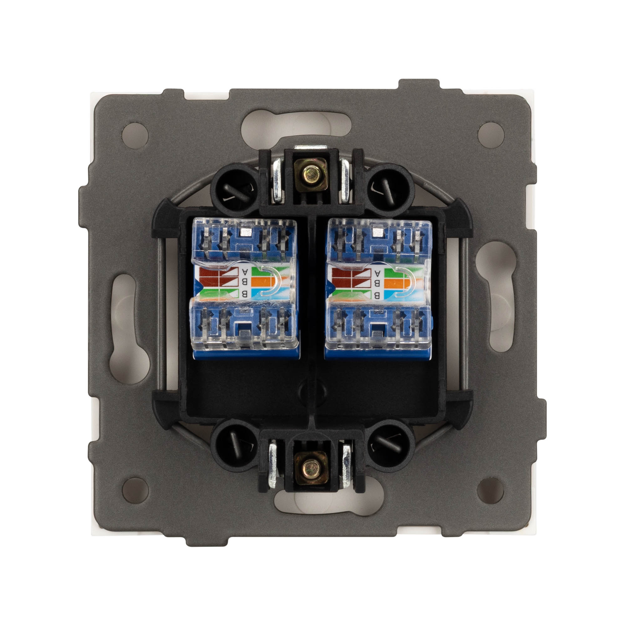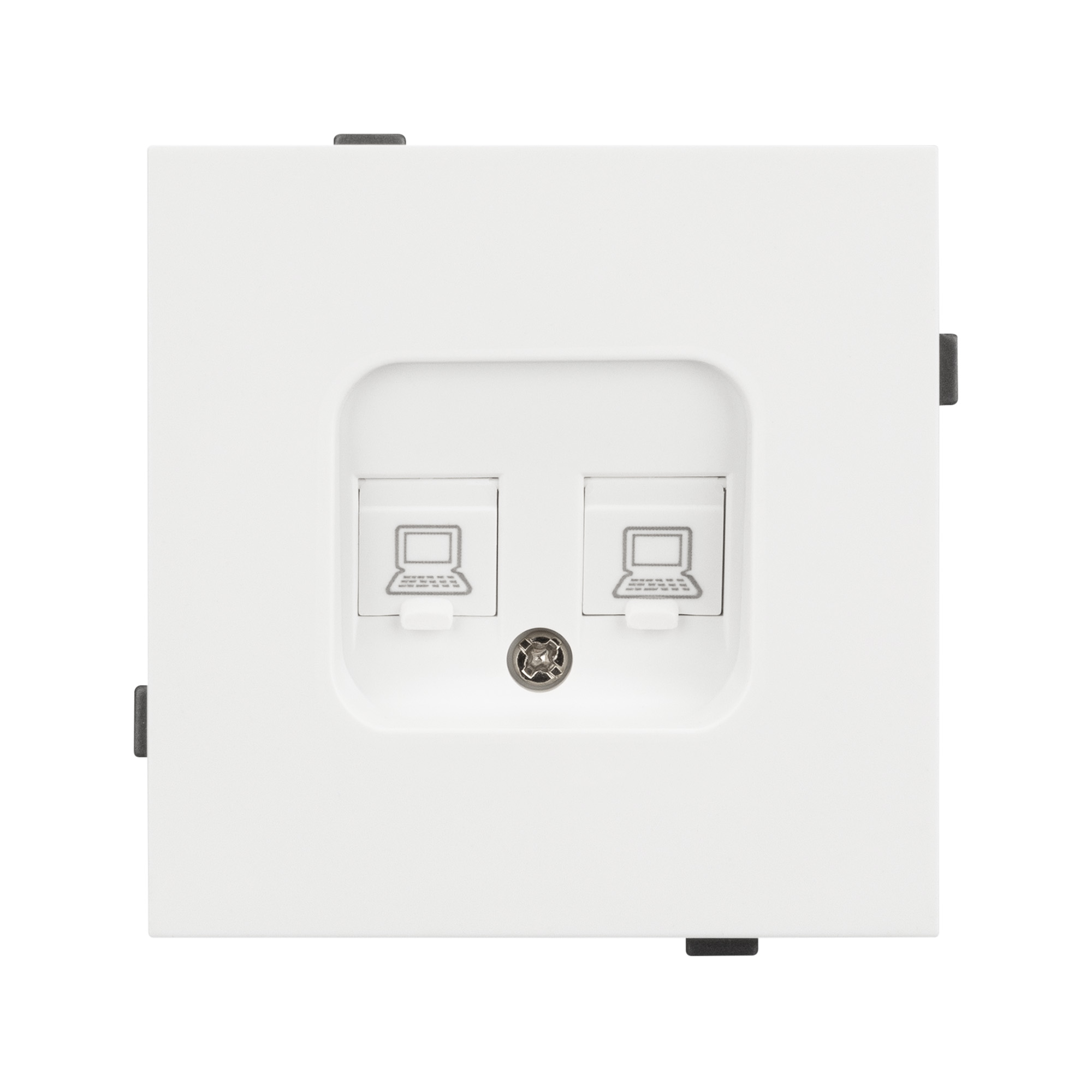 Механизм компьютерной розетки на 2 поста 6-й категории. Цвет - белый, с Soft-Touch покрытием. Без фронтальной рамки. Уровень пылевлагозащиты IP20. Розетка устанавливается в стандартный подрозетник круглого сечения диаметром 60мм.