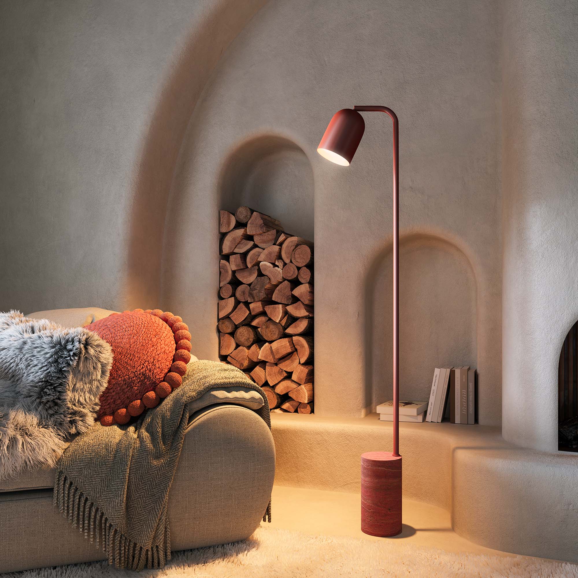Напольный светильник MASON. Мощность 6 Вт, световой поток 530 лм, световая эффективность - 88 лм/Вт, с изменяемой цветовой температурой 2700/3200/4000K, CRI>90, угол 120°, напряжение питания 230 В. Корпус цвета бургунди из алюминия, напольная база из натурального камня (красный травертин). Сенсорная кнопка на плафоне для настройки яркости и цветовой температуры. Степень пылевлагозащиты: IP20. Размеры: диаметр плафона 120 мм, высота плафона 170 мм, диаметр напольной базы 140 мм, общая высота светильника 1430 мм. Цвет и текстура камня могут отличаться.